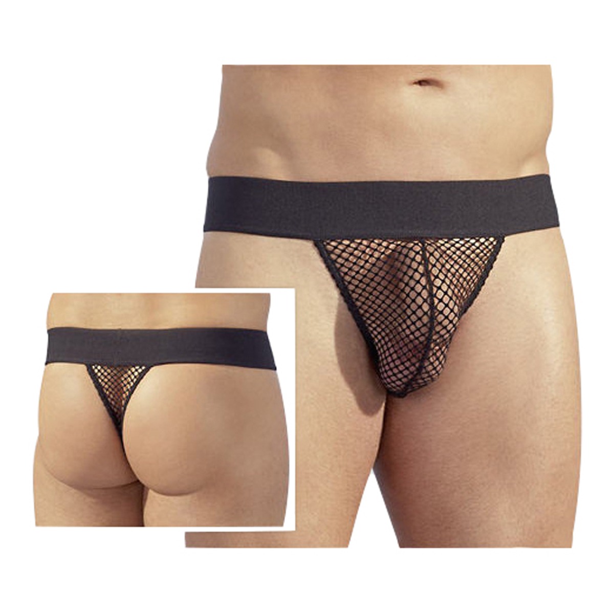 Black G-string made of soft net material and an extra wide waistband made of woven rubber. 100% polyamide.